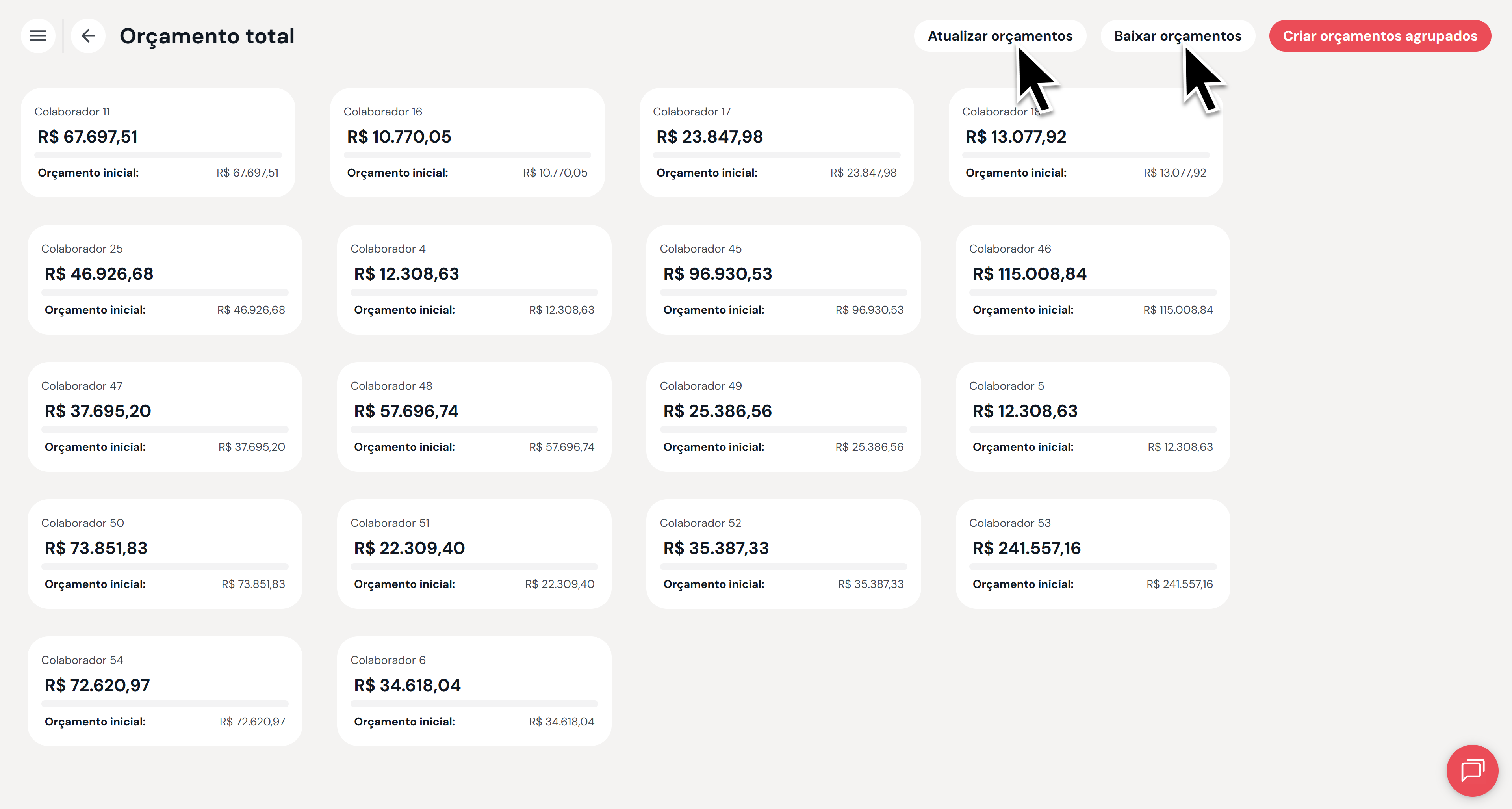Forma agrupada – um aprovador visualiza o seu próprio orçamento somado ao orçamento dos seus liderados, em etapas nas quais ele pode gerenciar também os valores dos liderados (realiza aprovações).