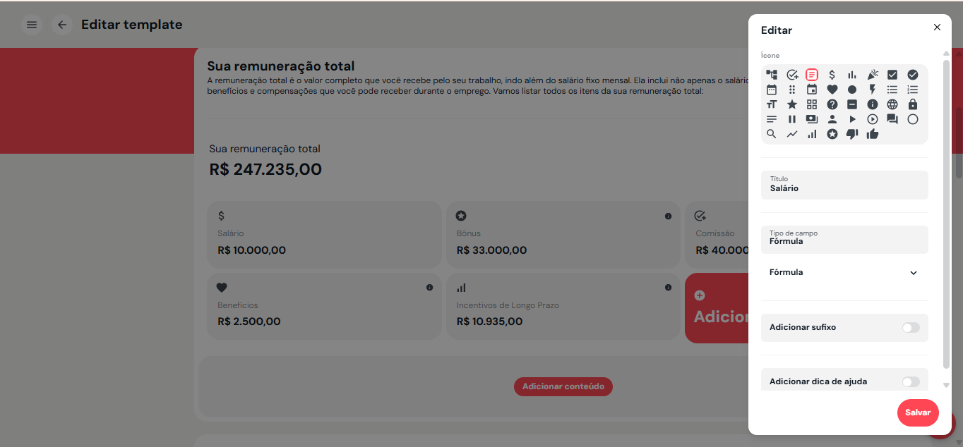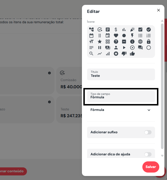 Adicionar sufixo (Opcional): Inclua um sufixo, pode ser usado para incluir um texto após o valor. Por exemplo, exibir um card de bônus com a informação "3 salários" ao invés de apenas "3".