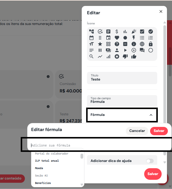 Para escolher um valor da tabela de colaboradores, clique em fórmula.